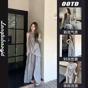 2025夏季新款复古宽松不规则无袖背心上衣阔腿休闲裤女时尚两件套