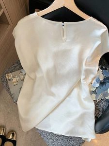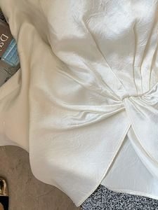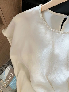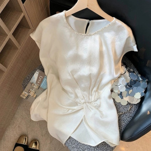 フレンチアプリコットプリーツビーズアセテートサテントップ女性のための 2025 夏の新しい気質ウエストファッショナブルなシャツ