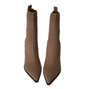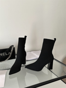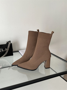 2025年秋冬季新款韩式百搭尖头袜靴女高跟弹力瘦瘦靴女粗跟中筒靴