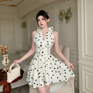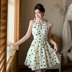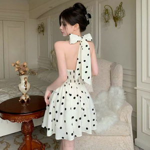 蝶ネクタイバックレス水玉ホルターネックドレス夏の新しい甘くてスパイシーなウエスト痩身気質Aラインショートスカート