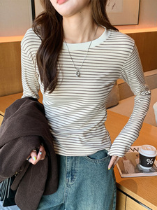 圆领条纹拼接打底衫女秋冬季内搭修身显瘦外穿T恤长袖上衣女
