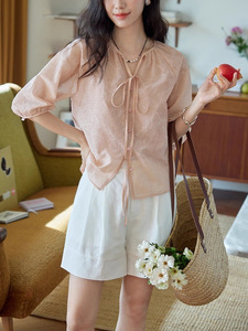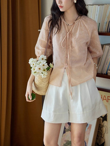 フレンチルーズテクスチャー/カットフラワーランタンスリーブレースアップシャツレディース夏フレンチレトロ気質トップ