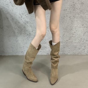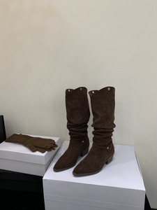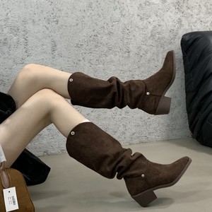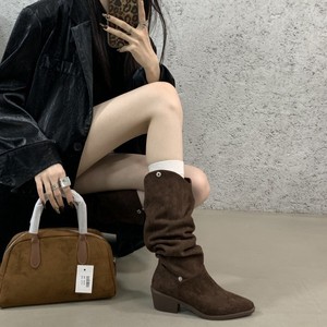 法式复古咖色堆堆靴西部牛仔靴2025秋高筒靴女靴子粗跟卡其色长靴