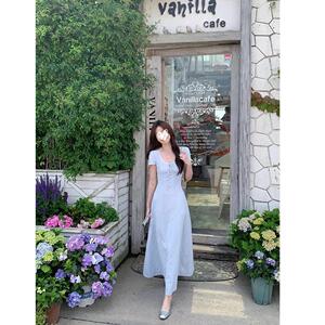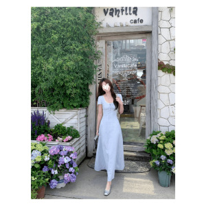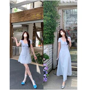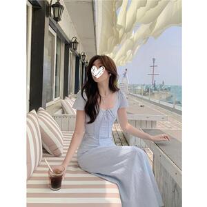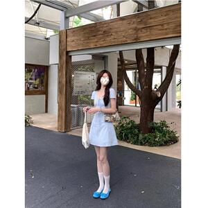 柔蓝一水韩系高智感法式蕾丝拼接假两件气质收腰连衣裙