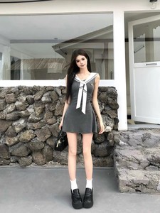 纯欲风甜美短裙春夏收腰显瘦设计感学院风海军领无袖气质连衣裙女