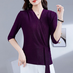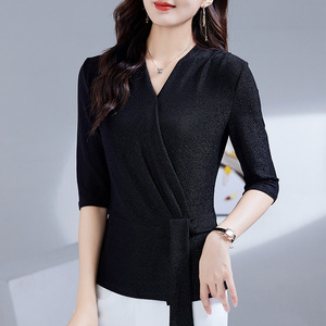 2025年新作Vネックウエスト痩身ボトムシャツ中年ママおしゃれな五分袖シャツミッドスリーブメッシュトップ