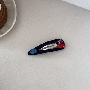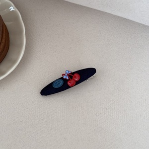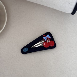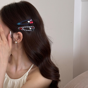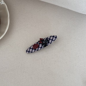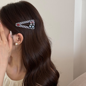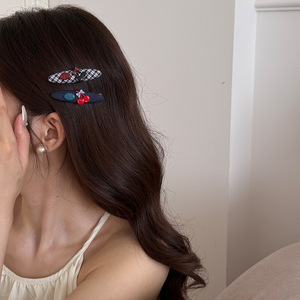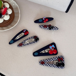 ダークブルーチェック柄生地レッドチェリーラインストーンヘアピンかわいいサイドクリップ前髪クリップBBクリップカモノハシクリップ新しいヘアアクセサリー