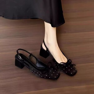 女性のための黒のスクエアトゥシングルシューズ 2025 新しいサテンラインストーンリボン本革ワンラインバックル厚いヒール包頭サンダル