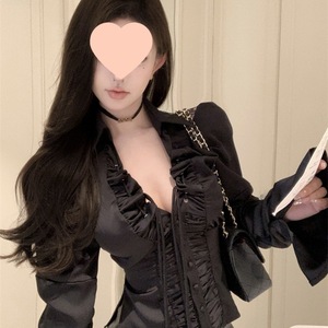 蕾丝拼接露背长袖衬衫女夏季修身绑带领衬衣设计感甜辣红色上衣