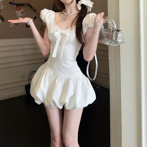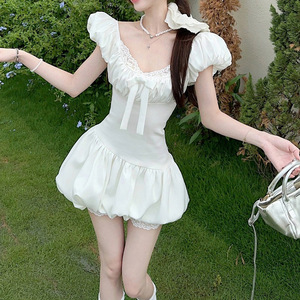 百搭甜美风蝴蝶结白色蓬蓬连衣裙女 夏季蕾丝边气质A字裙短裙批发