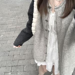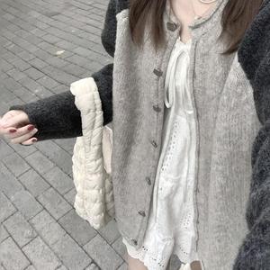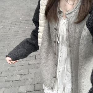 慵懒复古学院风灰色长袖毛衣女装秋冬拼接插肩袖针织开衫上衣外套
