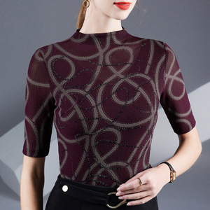 春と秋の新作、ファッショナブルで多用途なシャツ、ハーフタートルネック、ホットダイヤモンドメッシュベースレイヤー、年齢を軽減するファッショナブルな七分袖レディーストップス
