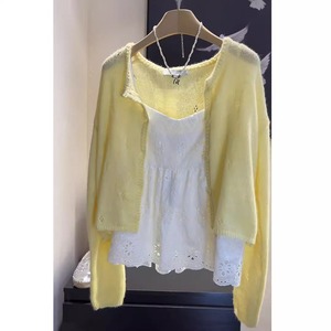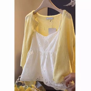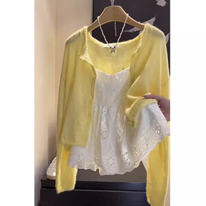 春季活泼减龄穿搭女新款甜美奶系显瘦镂空针织开衫吊带裙两件套装