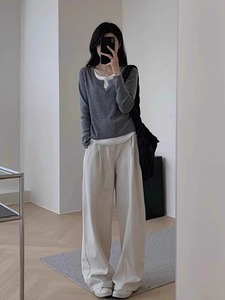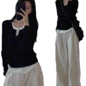 别致不规则下摆上衣女春秋内搭假两件拼接长袖T恤修身打底衫