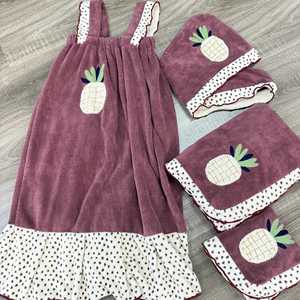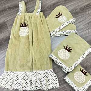 新款 刺绣水果撞色珊瑚绒毛巾浴巾女宿舍洗头吸水速干浴裙 干发帽