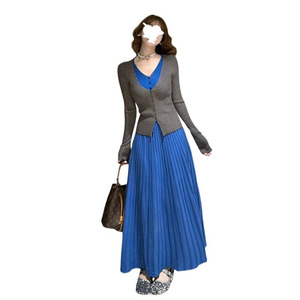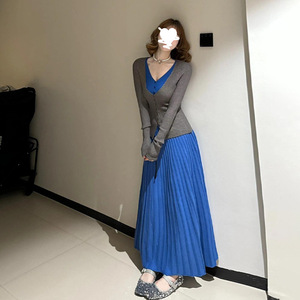 开春气质穿搭一整套假两件蓝色连衣裙子女2025新春季套装长裙