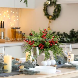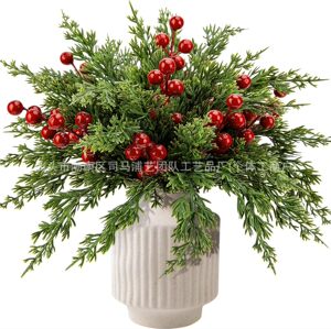 跨境塑料仿真松柏支红浆果绿植组合圣诞松针家居餐桌插花装饰摆件