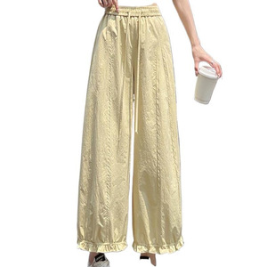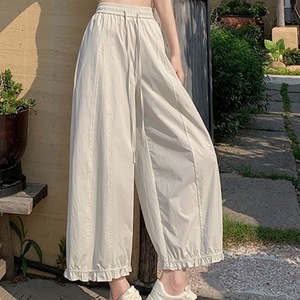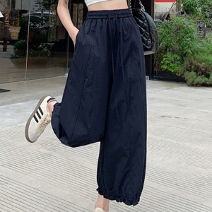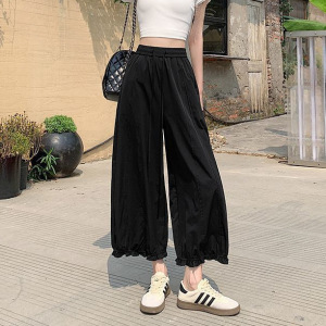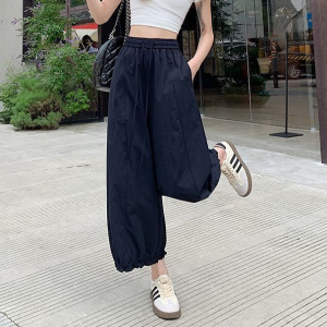 藏青色阔腿裤女夏季薄款冰丝花苞灯笼裤高腰显瘦边九分裤