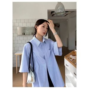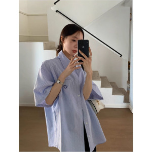 BWKA多巴胺笑脸刺绣短袖衬衣女男夏季潮牌宽松翻领条纹衬衫T恤ins