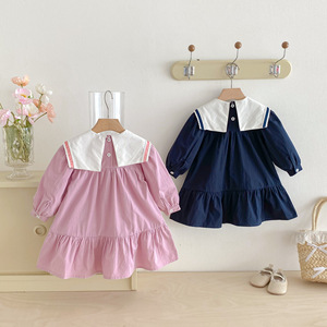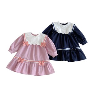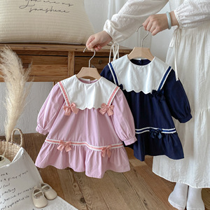 女の子ドレス秋の新しいカレッジスタイルラペルリボン小中型子供ネイビーカラー女の赤ちゃん子供服スカート