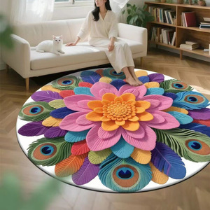 3D效果孔雀花卉圆形水晶绒印花地毯家用装饰客厅防滑易打理沙发毯