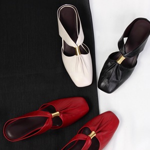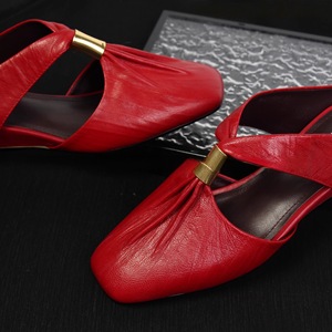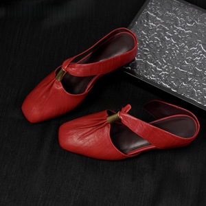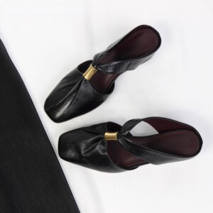 现货【网红同款】方头软皮法式坡跟褶皱包头粗跟拖鞋女半拖外穿凉