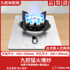 九腔猛火灶+铜质火盖加厚不锈钢+熄火保护