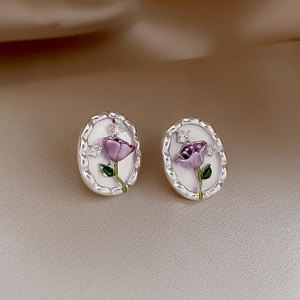 油画风紫色郁金香花朵耳环法式宫廷风滴油耳钉高级感百搭珍珠耳饰