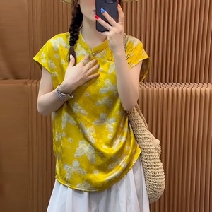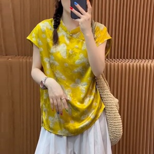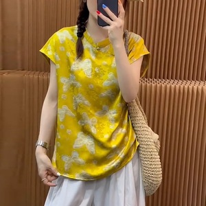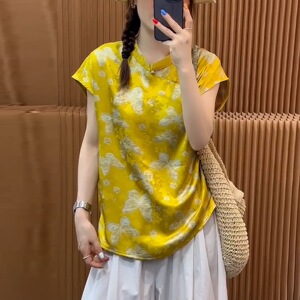 大牌国风新中式黄色立领2025夏季新款香云纱蝴蝶提花上衣短袖女装