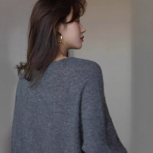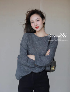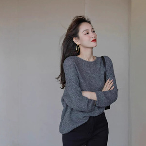 UM秋冬新款女装毛衣纯羊毛慵懒风圆领女上衣纯色宽松长袖针织短款