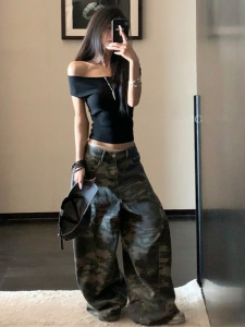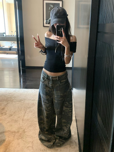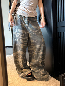 大码辣妹复古迷彩设计感阔腿牛仔裤女夏季高腰显瘦潮流百搭拖地裤