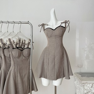 中古腔调 格纹高腰线条显瘦连衣裙夏