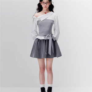 2025 斜め肩パッチワークフェイクツーピースドレス