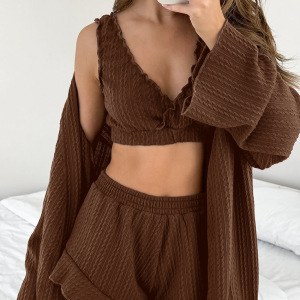 欧美2025秋季新款时尚针织开衫长袖内衣短裤睡衣三件套提花家居服
