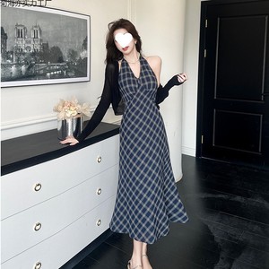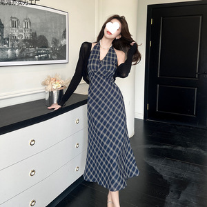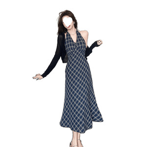 2025夏季新款挂脖领斜裁格纹吊带连衣裙显瘦高腰字长款裙两件套好