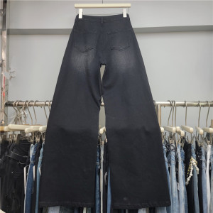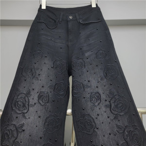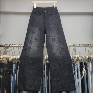 2025秋季新款黑色玫瑰刺绣钉珠阔腿直筒宽松弹力牛仔高腰长裤女装