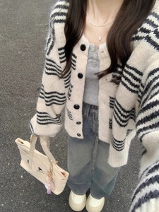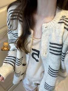 韩系黑白条纹小香风外搭毛衣外套慵懒针织衫春秋季短款宽松开衫女