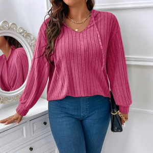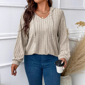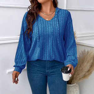 2025 アマゾン秋冬新無地大きいサイズレディーストップス V ネックフード付き長袖ピット起毛 T シャツルーズ