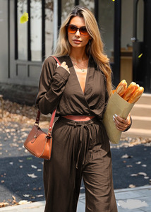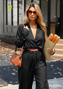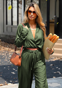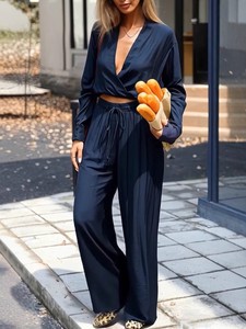 2025外贸欧美跨境女装纯色宽松深V领长袖上衣+直筒裤两件套装轻熟