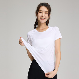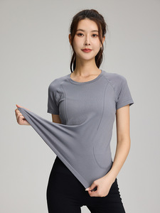女性用のシームレスな抗菌ラウンドネックスリムヨガトップ、スリムランニングスポーツフィットネス半袖ウエスト通気性ヨガウェア