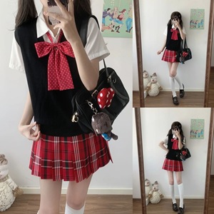超ショートペッパーグリッドスカート+赤水玉蝶ネクタイ