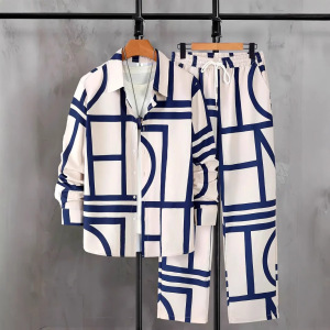 美式跨境2025新款休闲时尚湖流线条男士长袖村衫长裤套装满版印3d