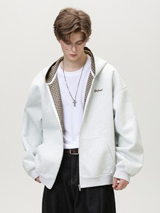 コントラストカラー千鳥格子裏地付きフード付きスウェットシャツメンズ秋トレンディブランドレター刺繍カーディガンジャケットショートワイドカジュアルジャケット
