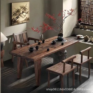 北の古いニレ材のダイニングテーブルと椅子無垢材の炉茶テーブル家庭用長方形わびさびスタイルのレジャーテーブルレトロなティーテーブル
