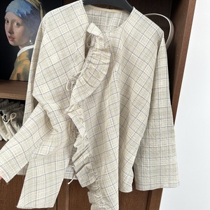 新中式荷叶边系带斜襟复古格纹圆领长袖衬衫