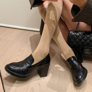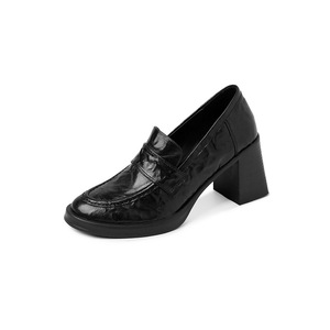 大きな長い脚のシープスキンハイヒールローファー 2025 秋厚いヒールラウンドトゥ本革通勤小さな革靴深い口のシングルシューズ女性のための