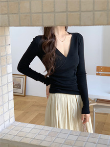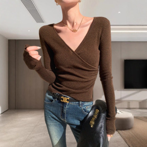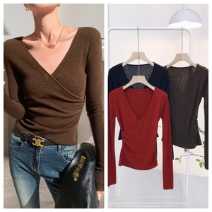8137 秋冬季新款羊毛混纺法式复古V领交叉收腰褶皱修身显瘦上衣女
