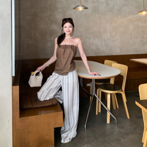 泰兰德穿搭套装复古印花抹胸背心外穿上衣女夏季条纹休闲裤两件套