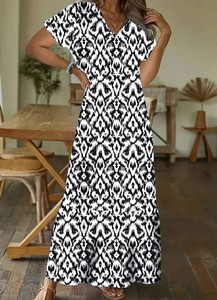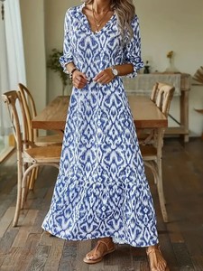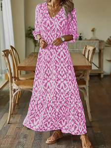 2025欧美独立站秋冬时尚达人休闲甜美宽松V领印花中袖长款连衣裙