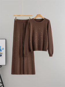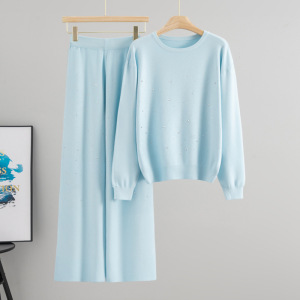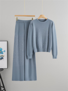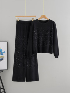 跨境欧美秋季新款时尚烫钻圆领宽松针织毛衣休闲阔腿裤女
